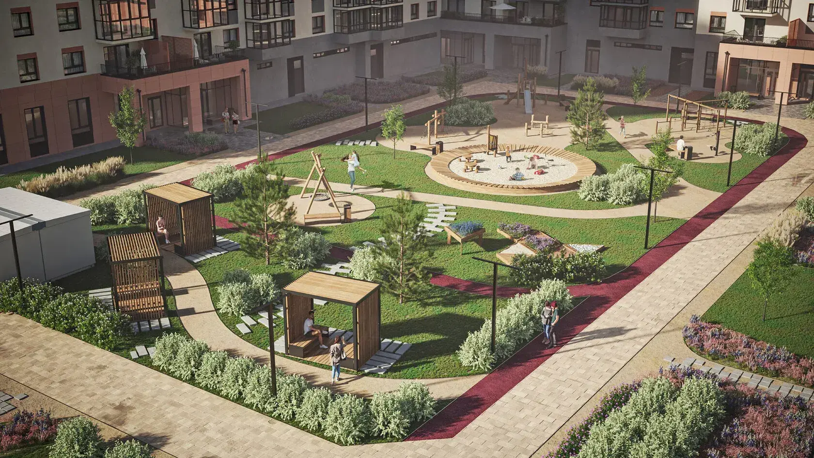 Концепция комплекса предполагает развитие территории по принципу «город в миниатюре». В проекте заложены три детских сада и современная школа с собственным спортивным блоком. Для жителей предусмотрены прогулочные бульвары, велосипедные дорожки, игровые зоны, места для отдыха и сенсорные сады.
